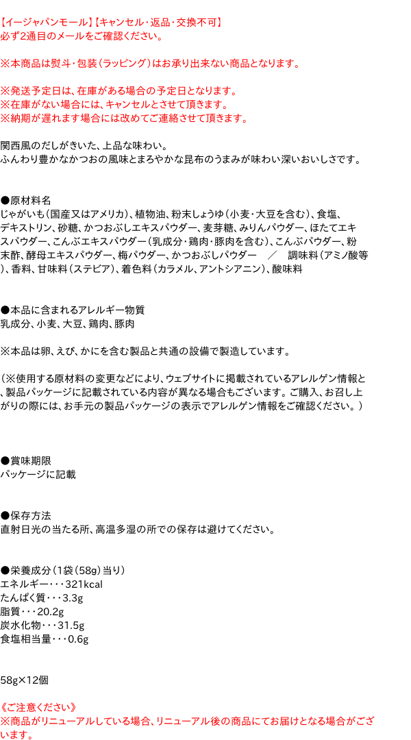 〜原材料名〜 じゃがいも(遺伝子組換えでない)、植物油、粉末しょうゆ(小麦・大豆を含む)、砂糖、食塩、デキストリン、かつおぶしエキスパウダー、ほたてエキスパウダー、みりんパウダー、麦芽糖、こんぶエキスパウダー(豚肉、鶏肉、乳を含む)、こんぶパウダー、粉末酢、梅パウダー、酵母エキスパウダー、かつおぶしパウダー、調味料(アミノ酸等)、香料、甘味料(ステビア)、カラメル色素、酸味料、ムラサキトウモロコシ色素 〜栄養成分(1袋(58g)当り)〜 エネルギー・・・321kcal たんぱく質・・・3.0g 脂質・・・20.2g 炭水化物・・・31.9g ナトリウム・・・256mg (食塩相当量・・・0.6g) 58g×12個【広告文責】株式会社イージャパンアンドカンパニーズ 072-875-6666《ご注意ください》 ※商品がリニューアルしている場合、リニューアル後の商品にてお届けとなる場合がございます。