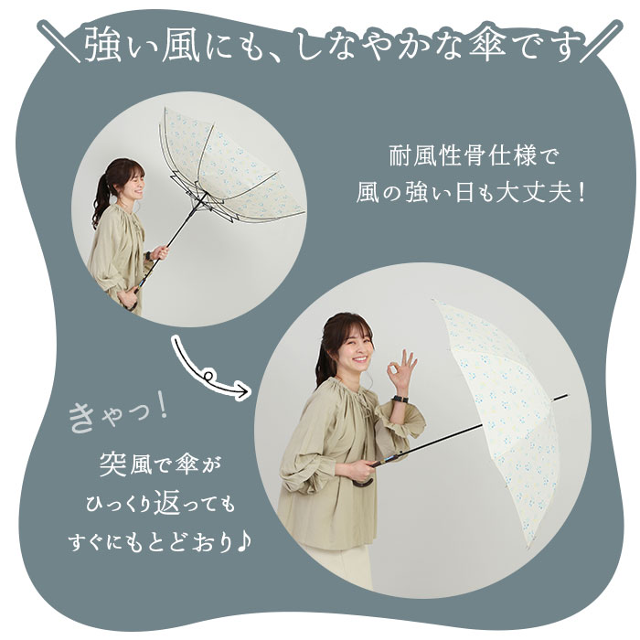・反り返っても傘骨が元に戻る、しなやかな耐風骨仕様で、風の強い日だって安心。
