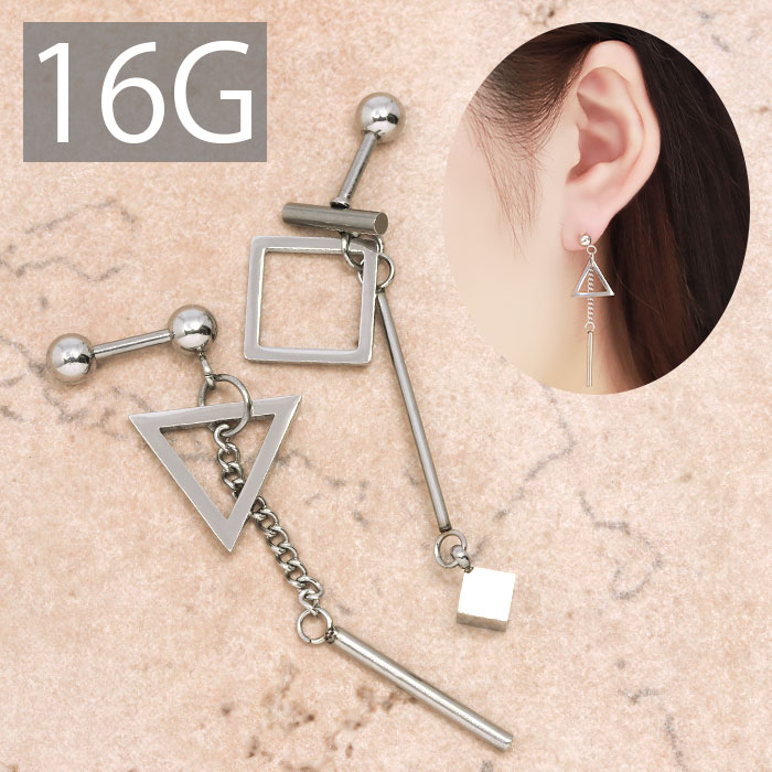 軟骨ピアス 16G ボディピアス チェーン チャーム スクエア トライアングル 四角 三角 ステンレス 16ゲージ ピアス ストレートバーベル 片耳用 サージカルステンレス 耳 軟骨 ピアス シルバー 金属アレルギー 対応 アレルギー